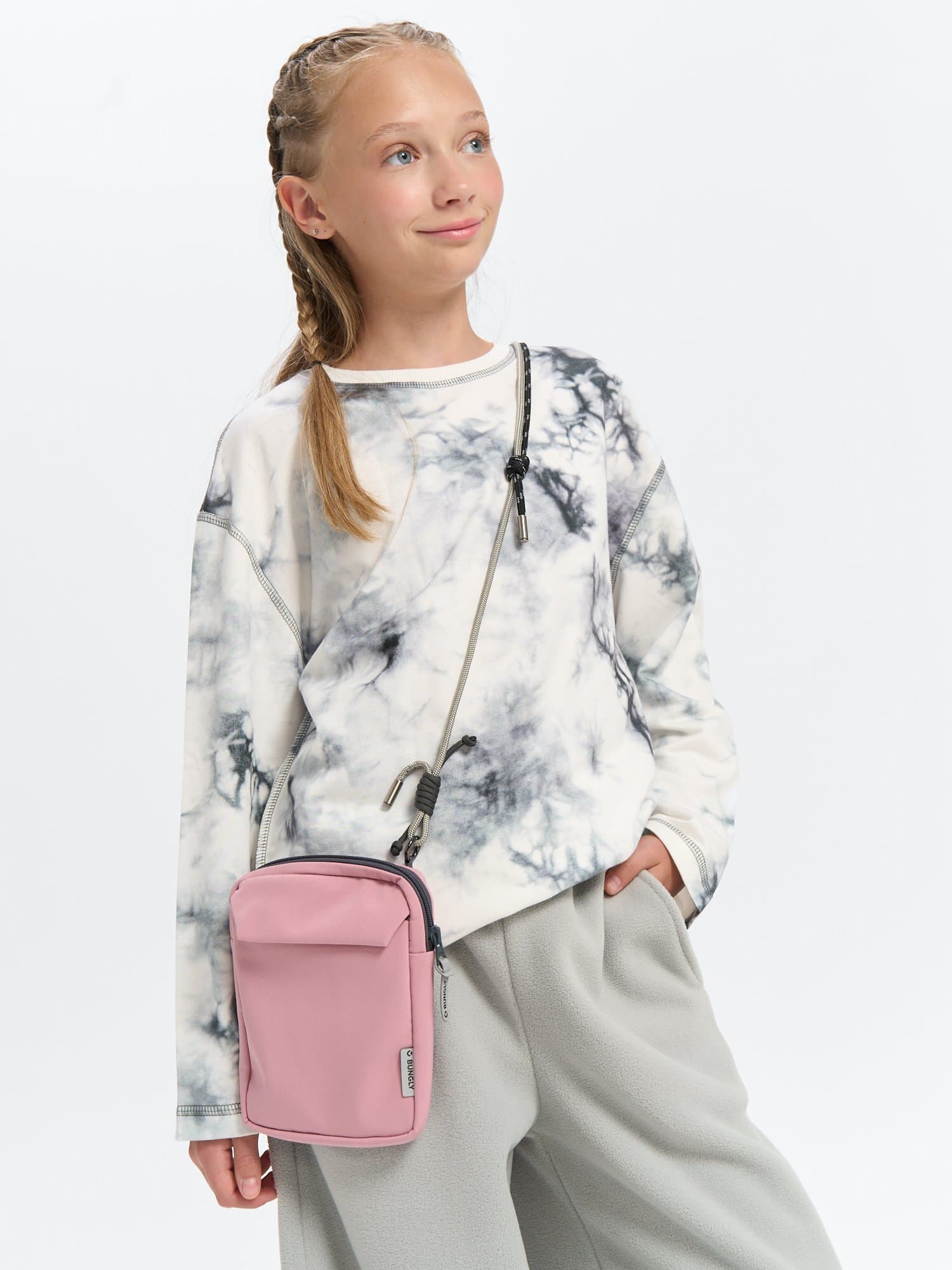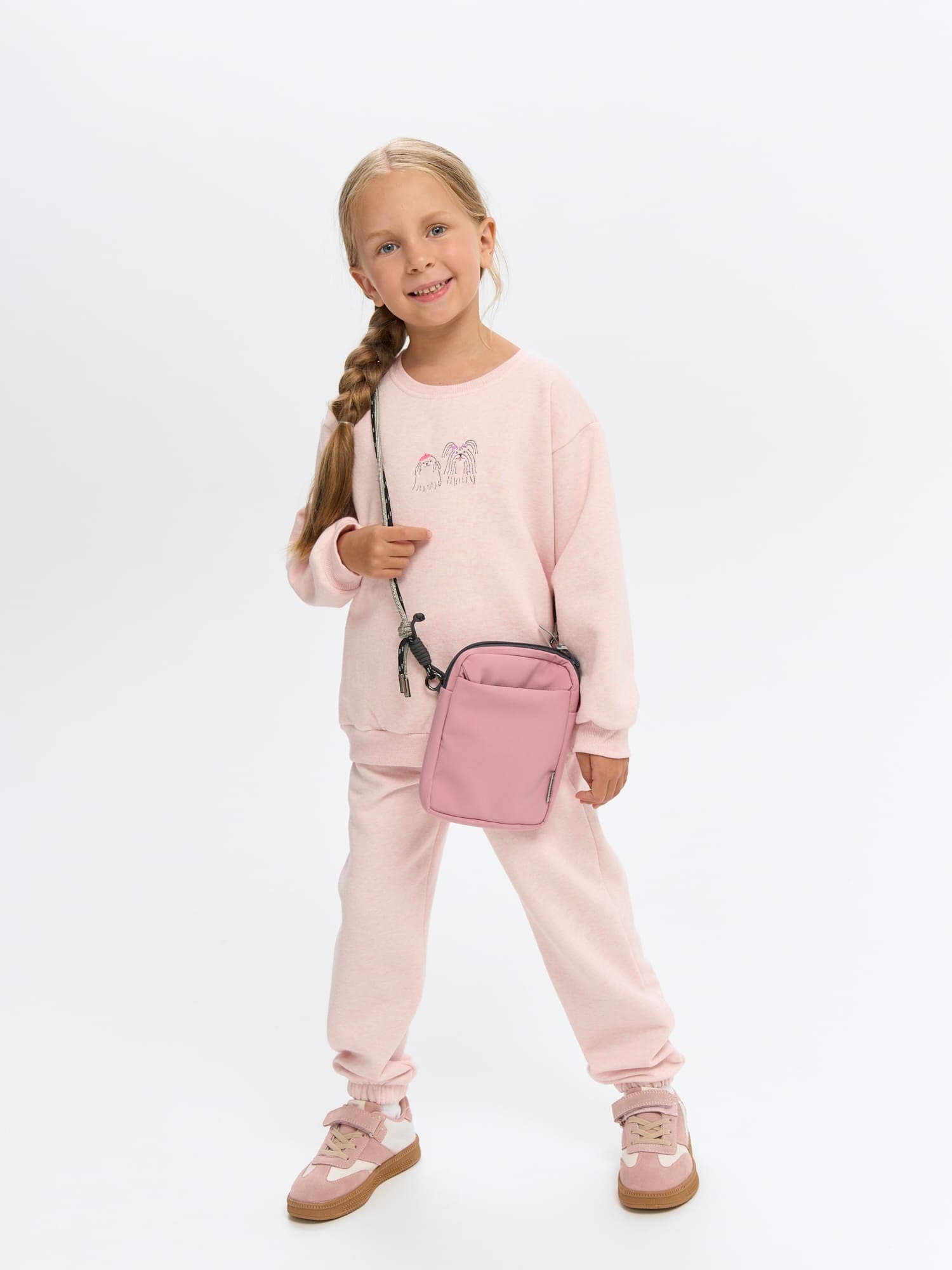 Спереди вместительный карман с клапаном, куда удобно положить билет, заколку или маленький блокнот. Внутри кармана спрятан пластиковый карабин на резинке-шнурке для ключей, чтобы не потерять их во время активных игр.