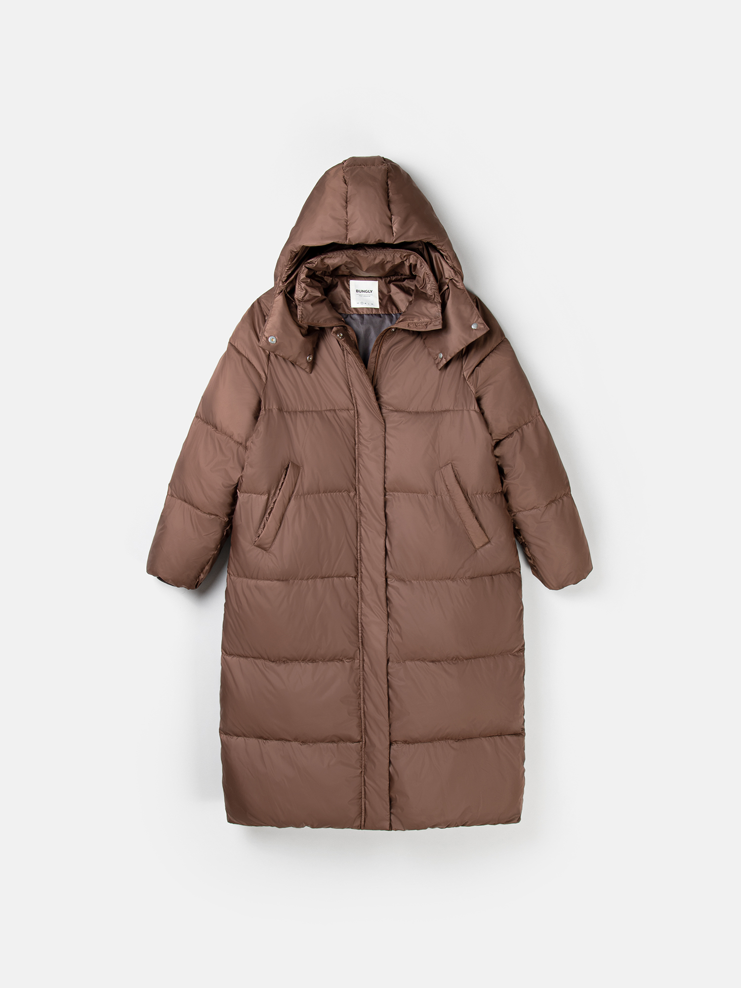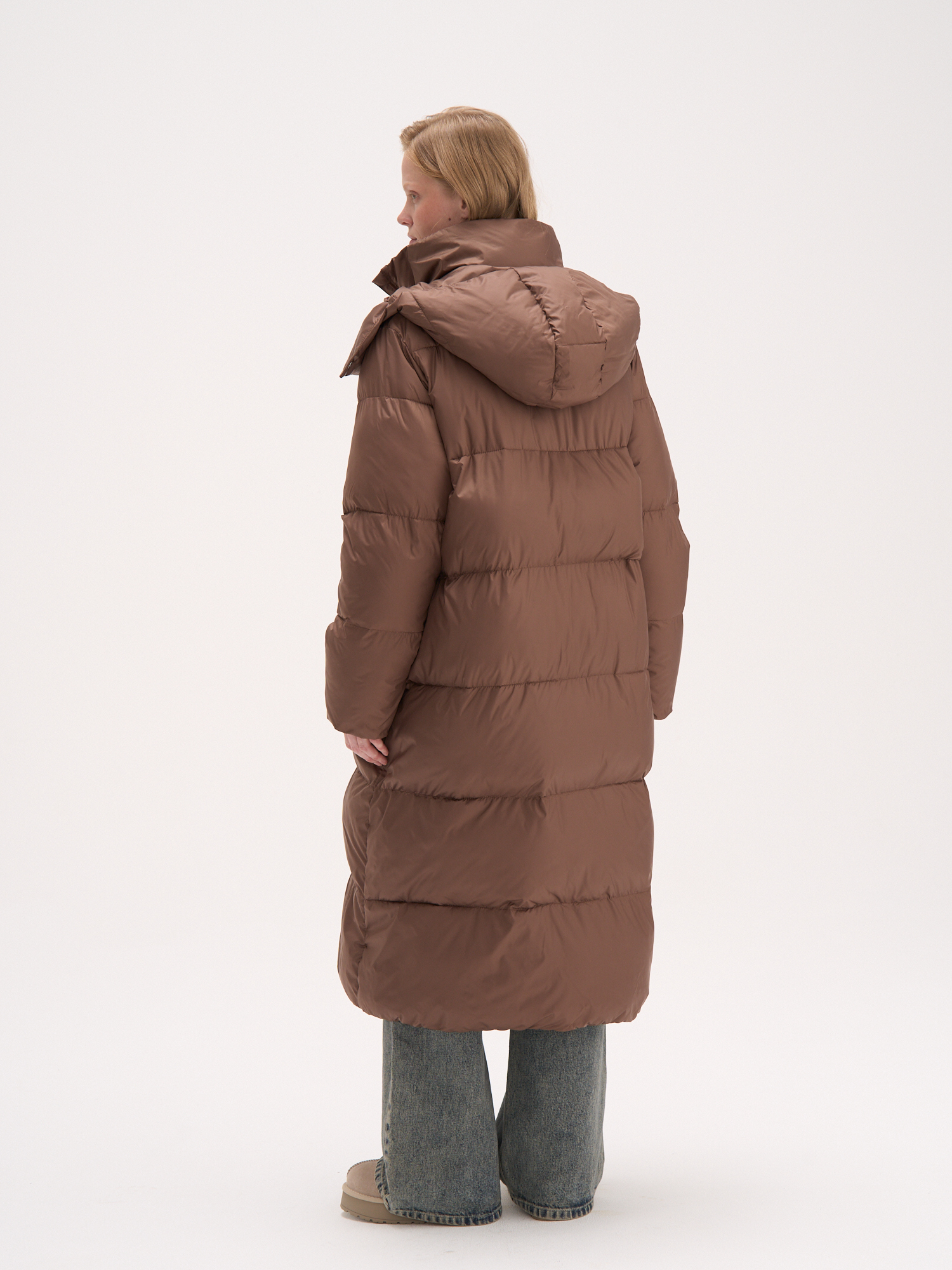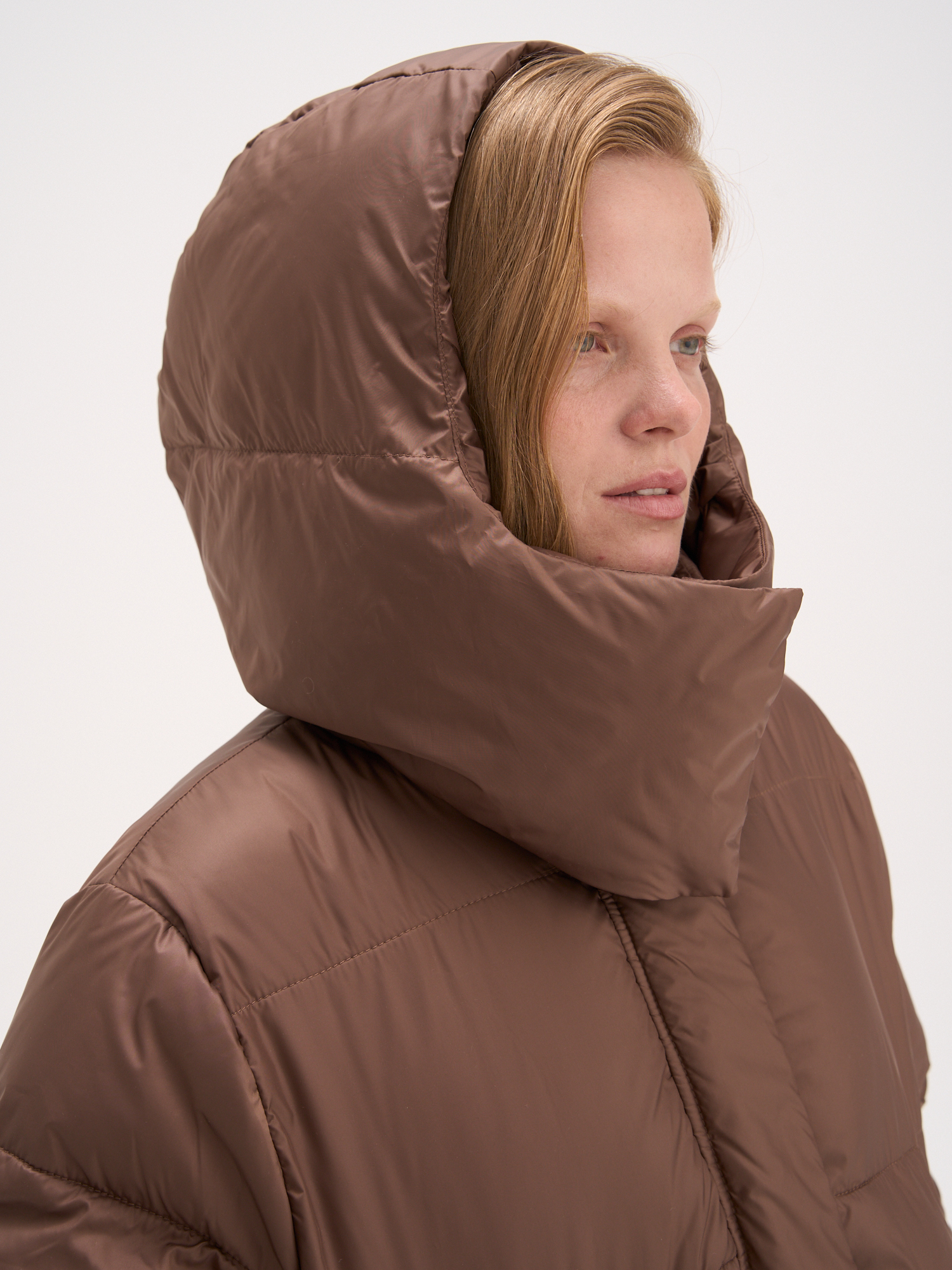 Теплый капюшон-шлем с высоким воротником защищает от ветра и холода и позволяет носить модель даже без шапки и шарфа.