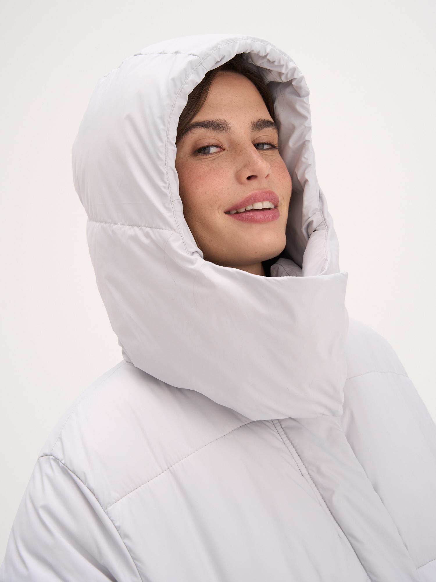 Теплый капюшон-шлем с высоким воротником защищает от ветра и холода и позволяет носить модель даже без шапки и шарфа.