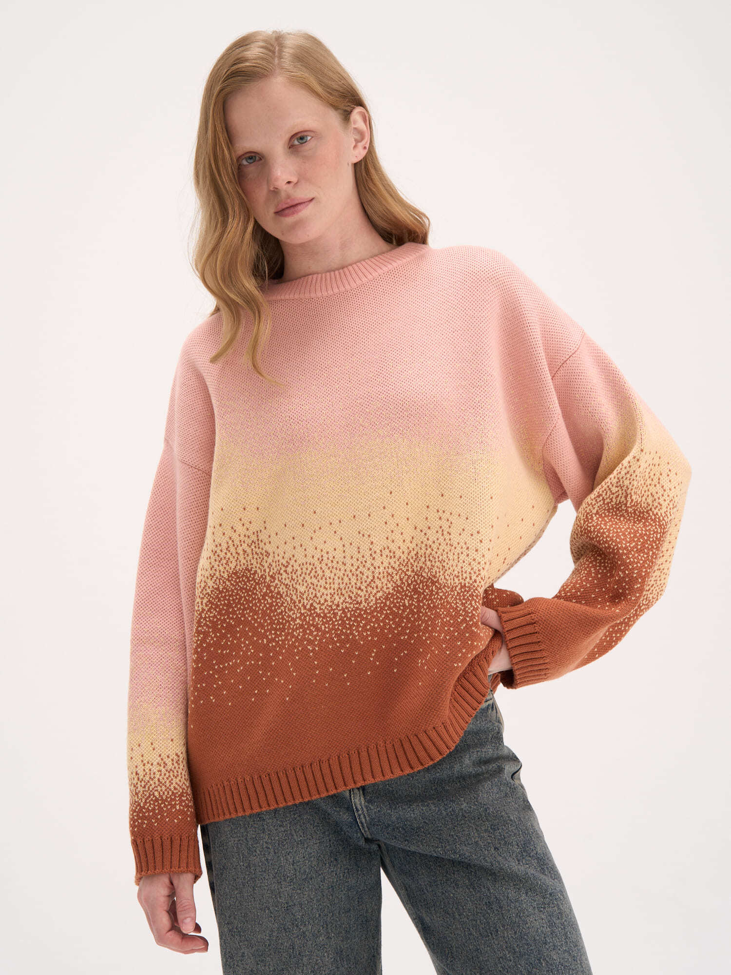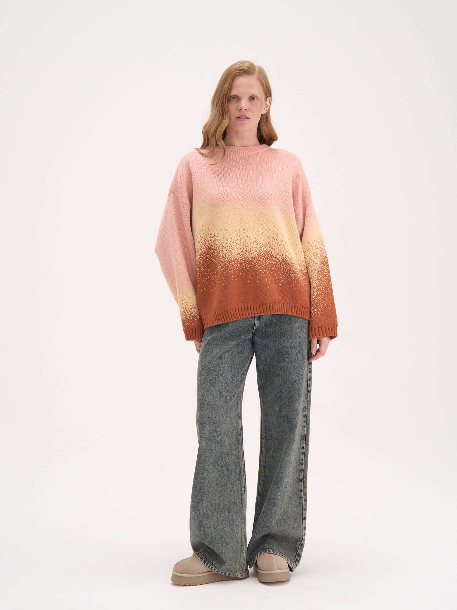 Джемпер свободной посадки с круглым вырезом горловины и спущенным плечом. Мягкий материал с добавлением шерсти мериноса сохраняет тепло и словно окутывает уютными объятиями. Идеально впишется в яркие образы с аксессуарами в тон или станет акцентной деталью в повседневном и более расслабленном образе.