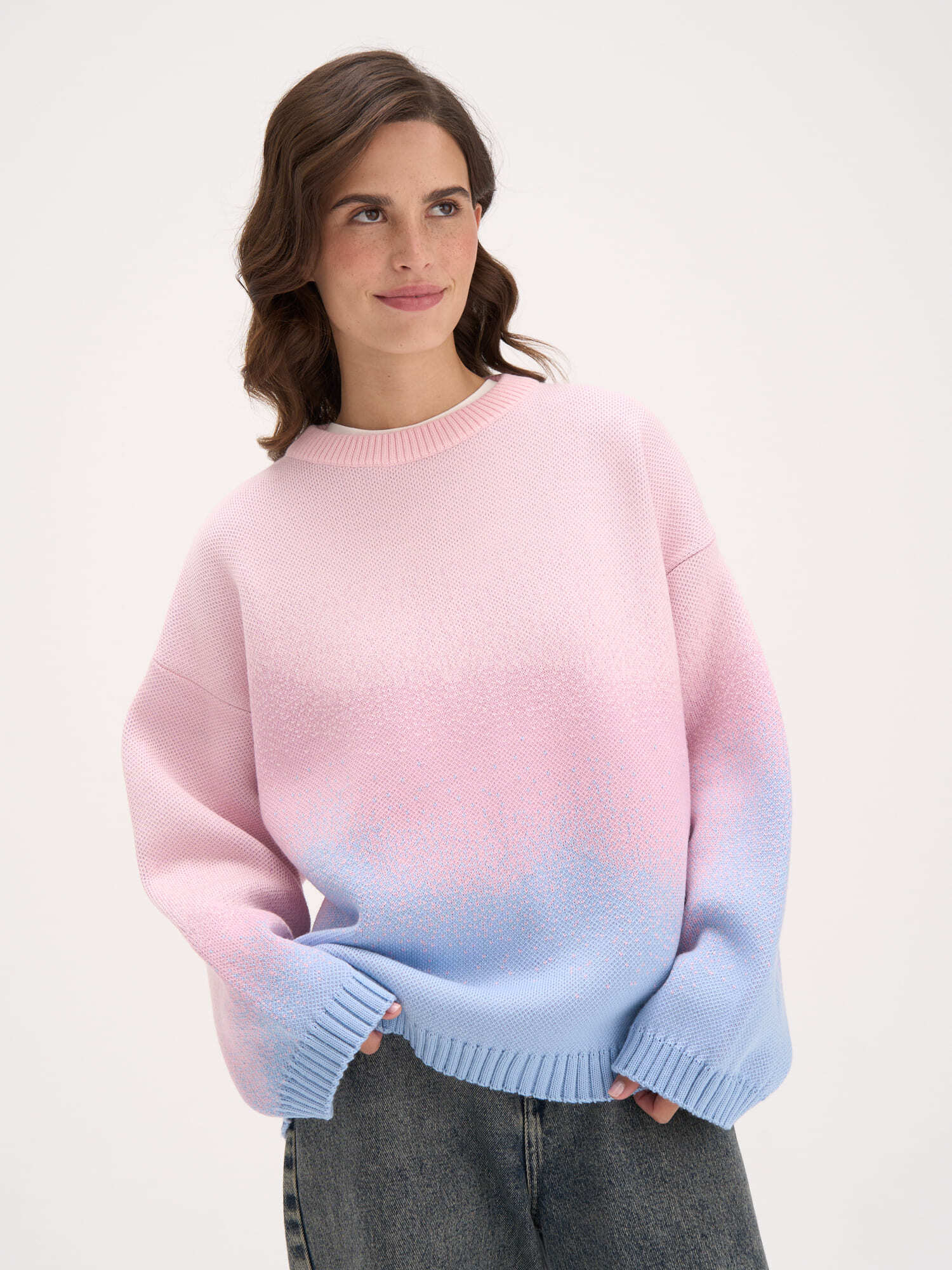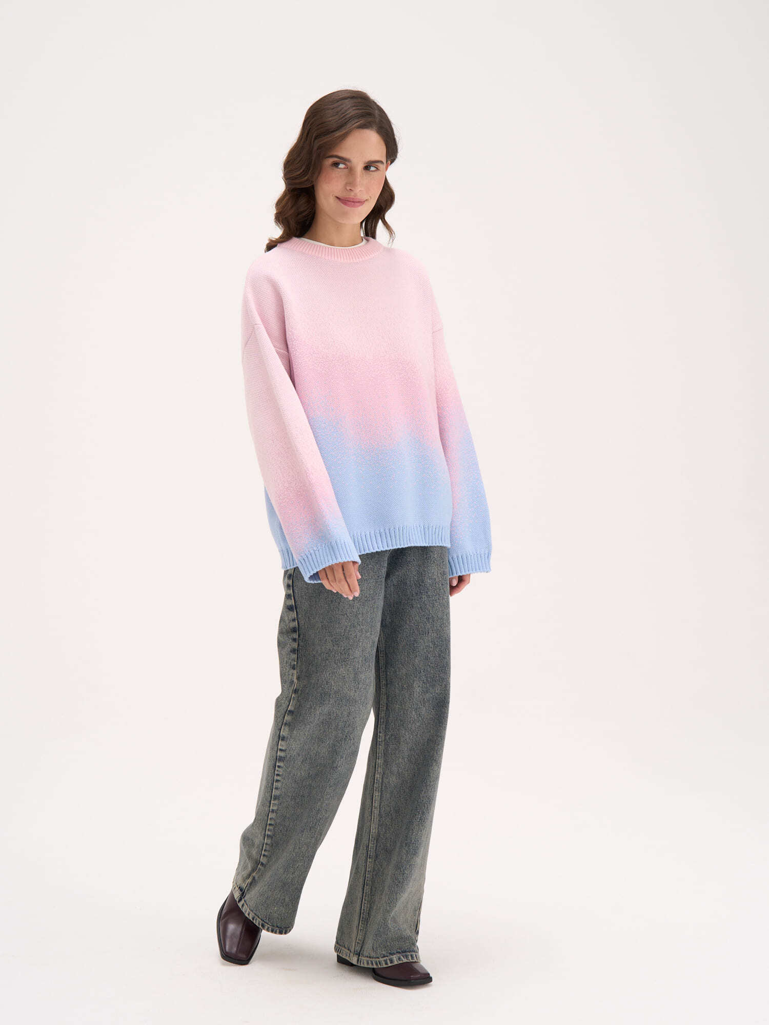 Джемпер свободной посадки с круглым вырезом горловины и спущенным плечом. Мягкий материал с добавлением шерсти мериноса сохраняет тепло и словно окутывает уютными объятиями. Идеально впишется в яркие образы с аксессуарами в тон или станет акцентной деталью в повседневном и более расслабленном образе.