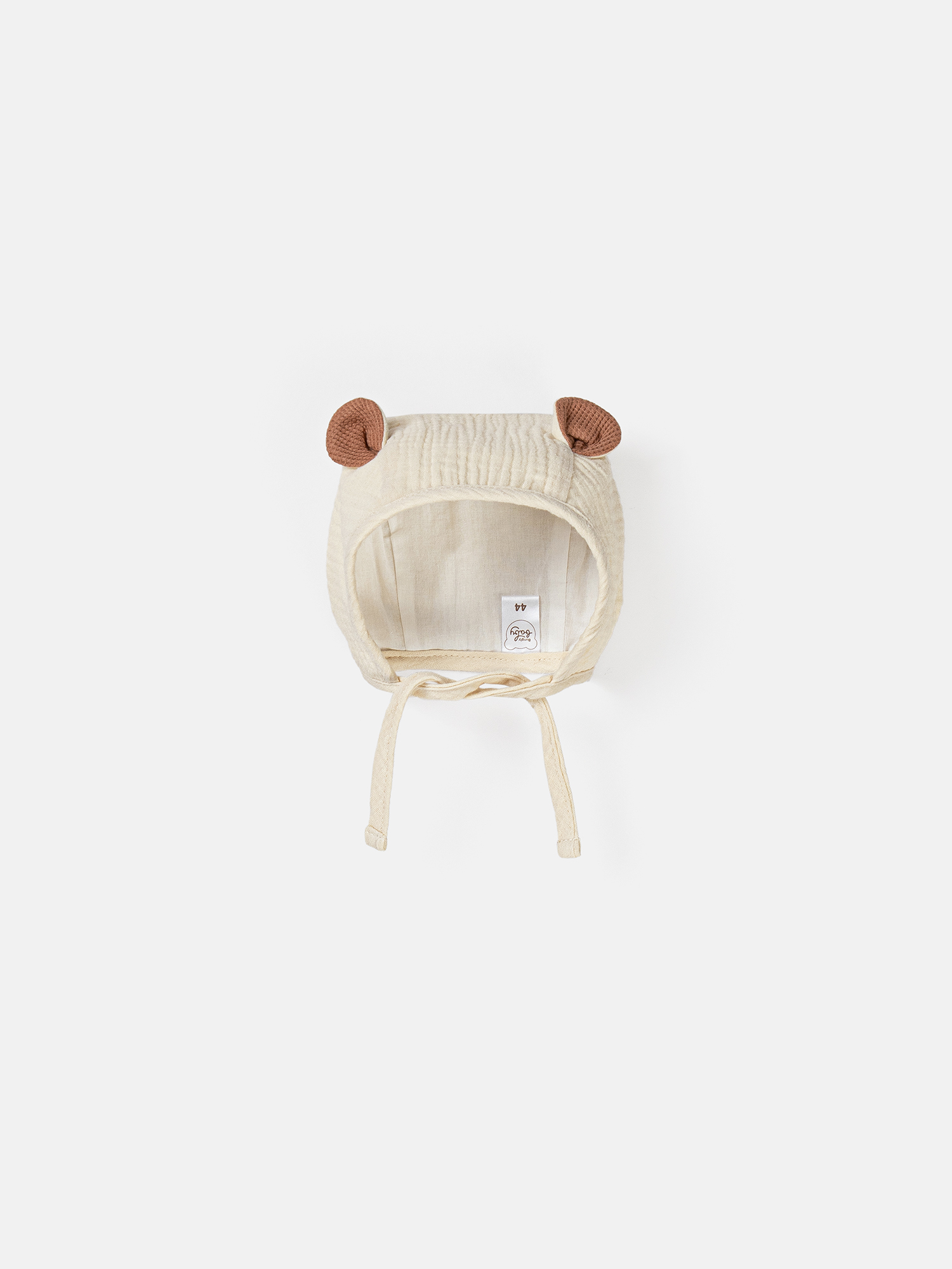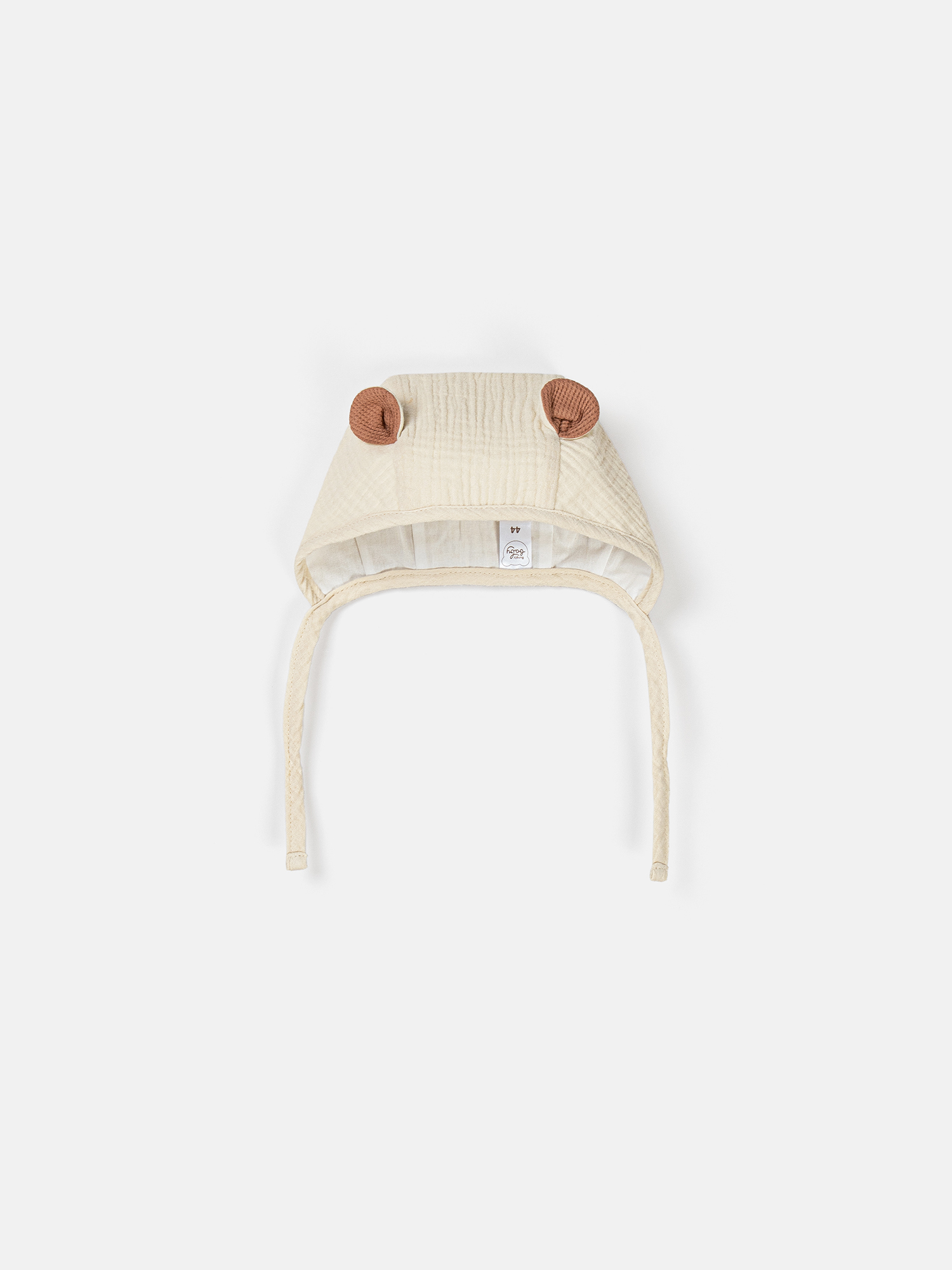 Чепчик из мягкого муслина с хлопковым подкладом и с очаровательными ушками на макушке.